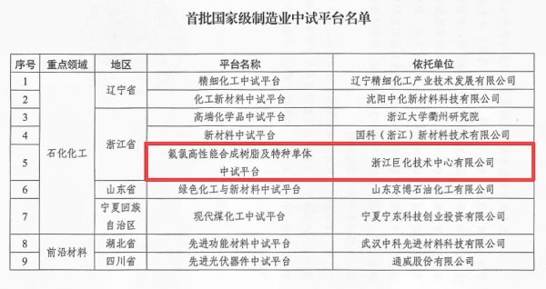 據(jù)全球液流電池網(wǎng)獲悉,近日,工業(yè)和信息化部正式公布首批國(guó)家級(jí)制造業(yè)中試平臺(tái)名單,巨化集團(tuán)下屬浙江巨化技術(shù)中心有限公司氟氯高性能合成樹(shù)脂及特種單體中試平臺(tái)榜上有名。
